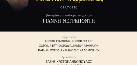 Συμμετέχουν ΕΘΝΙΚΗ ΣΥΜΦΩΝΙΚΗ ΟΡΧΗΣΤΡΑ της ΕΡΤ ΧΟΡΩΔΙΑ ΕΡΤ (διδασκαλία Νατάσσα Αγγελοπούλου) ΧΟΡΩΔΙΑ Δήμου Αθηναίων (διδασκαλία Σταύρος Μπερής) Παιδική Χορωδία “ΜΑΝΩΛΗΣ ΚΑΛΟΜΟΙΡΗΣ” (διδασκαλία Νίκος Μαλλιάρας) Ερμηνεύουν ΤΑΣΗΣ ΧΡΙΣΤΟΓΙΑΝΝΟΠΟΥΛΟΣ βαρύτονος ΙΩΑΝΝΑ ΦΟΡΤΗ μεσόφωνος Αναγνώστης ο ηθοποιός ΚΩΝΣΤΑΝΤΙΝΟΣ ΚΩΝΣΤΑΝΤΟΠΟΥΛΟΣ Διευθύνει ο ΜΙΧΑΛΗΣ ΟΙΚΟΝΟΜΟΥ *** Ο Γιάννης Νεγρεπόντης (1930 – 1991) γράφει το ποίημα «Φυλάττειν Θερμοπύλας» το 1971, πολιτικός κρατούμενος, μεσούσης της δικτατορίας του 1967. Μέσα σ’ αυτήν τη σκοτεινιά, ο ποιητής πάσχει να…